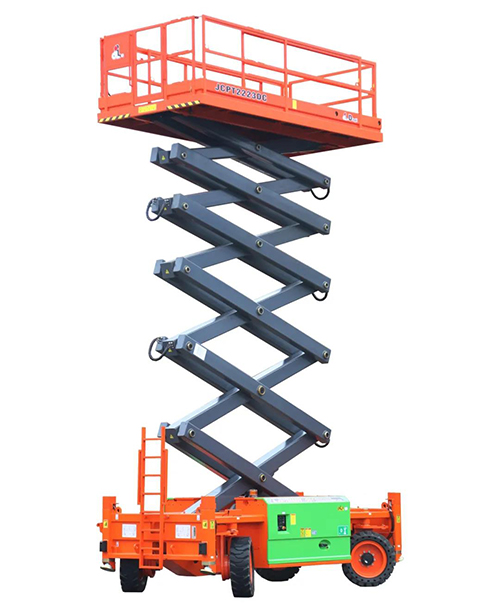 JCPT2223DC, does not change any parts, continues all characteristics of large rough-terrain scissor lift JCPT2223RTB, safe working load is 750kg, and the max. working height is 22 meters, with multiple people working at the same time.