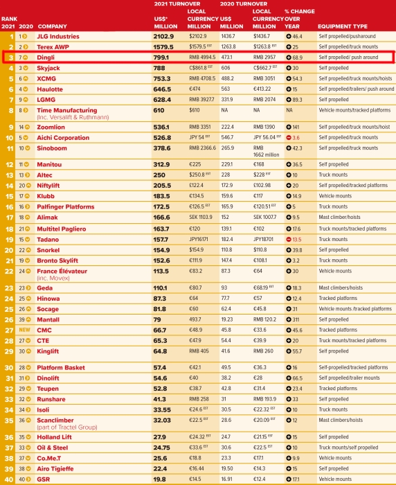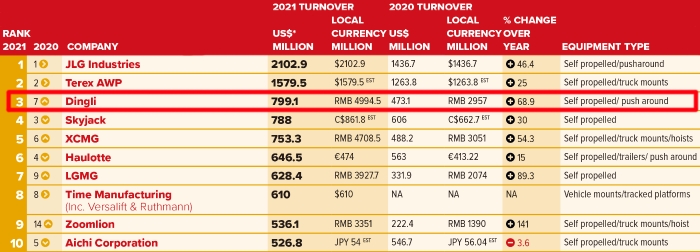 Dingli ranks the world’s 3rd in the list, preceded only by JLG and Terex Genie, making the first time for Chinese aerial work platform manufacturer to enter the global top three!