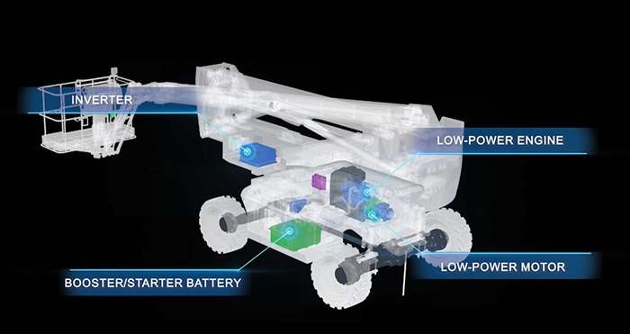 Apart from the machine color, the mild hybrid models share an identical appearance with Dingli's existing diesel, electric, and hybrid machines. Positioned between diesel and electric options, this series is equipped with a low-power engine and a high-capacity lithium battery pack.