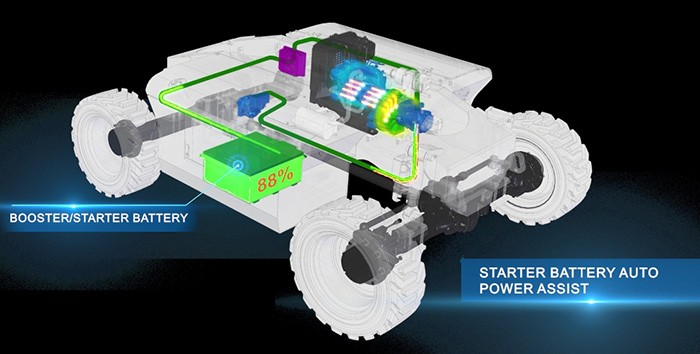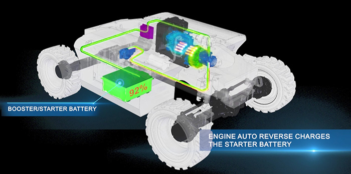 During regular operations, the lithium battery functions as the starter battery. Under normal conditions, the low-power engine continuously charges the lithium battery. In demanding scenarios, if the low-power engine lacks sufficient power, the lithium battery provides additional torque output, ensuring the machine combines high energy efficiency with strong performance.